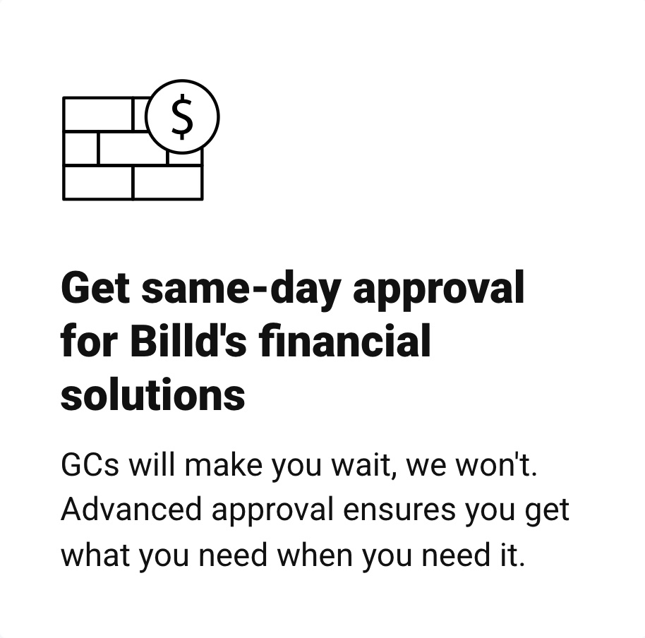Billd's products, including Material Financing and Pay App Advance, enable subcontractors to free their business from the broken repayment chain and ensure that they never come out of pocket to pay for materials.